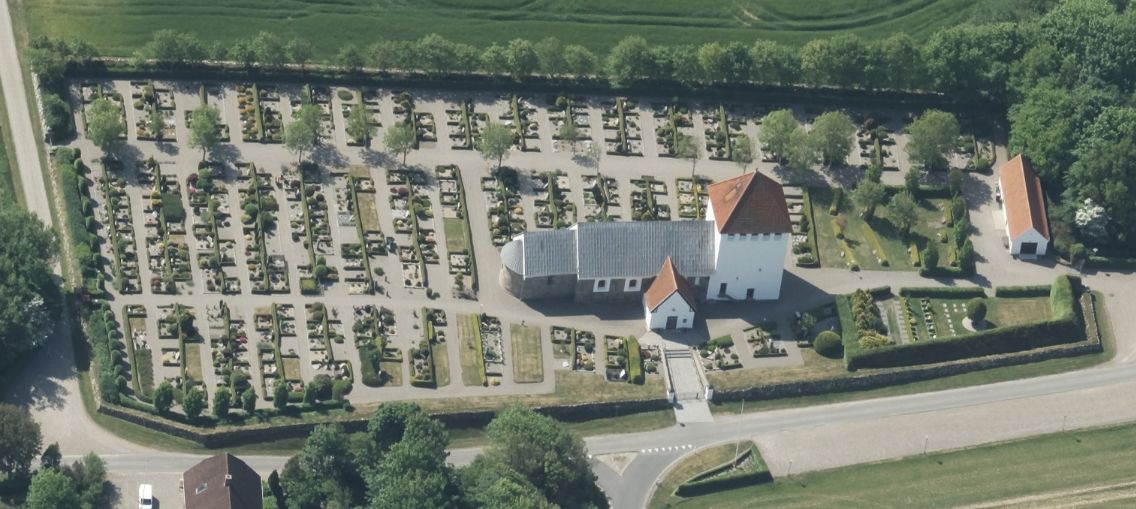 Dies ist ein Luftfoto vom 01.06.2023 - von Skråfoto - Lizenz: CC BY 4.0 - das die Kirche von Hørdum zeigt. Skråfoto ist eine Webanwendung, die von Klimadatastyrelsen weltweit kostenlos bereitgestellt wird. Die Aufnahmen werden seit 2017 alle zwei Jahre erneuert und neben einer Senkrechtaufnahme wird ein Schrägbild aus jeder Himmelsrichtung angeboten, das man über eine Adresssuche aufrufen kann.