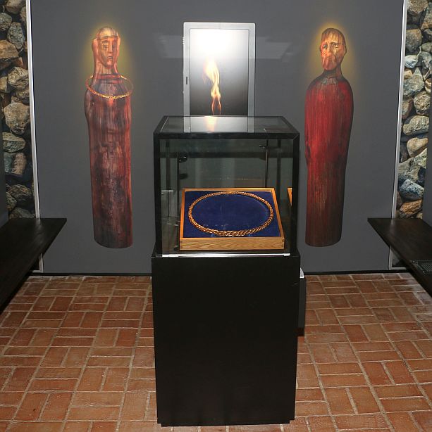 Der bemerkenswerteste Fund aus der Region Tissø, der goldene Halsring, wurde bereits im Frühjahr 1977 durch den Landwirt Lars Krogsager bei der Feldarbeit auf einem Stück Land gemacht, das schon auf einer Karte von 1786 "Goldacker" genannt wird. Von daher kann wohl vermutet werden, dass dies nicht der erste Fund dieser Art war. Der um 950 n. Chr. hergestellte Goldring hat einen inneren Durchmesser von ca. 31 cm, wiegt 1790 Gramm, ist aus vier miteinander verflochtenen Strängen aus fast reinem Gold gewunden und hatte den Wert von 500 Rindern in der Wikingerzeit. Für diesen Schatzfund konnte der Finder den bis dahin höchsten Finderlohn von 60.000 DKR entgegennehmen! Das Original befindet sich im Nationalmuseum in Kopenhagen. Als er 1994 von dort an das Moesgård Museum ausgeliehen war, wurde er durch Einbrecher gestohlen und kam erst gegen ein hohes Lösegeld von 175.000 DKR am 29.06.1994 - acht Tage nach dem Diebstahl - wieder zurück. Glücklicherweise wurde er vom Dieb nicht eingeschmolzen, wie es 1802 den beiden berühmten Goldhhörnern von Gallehus erging!