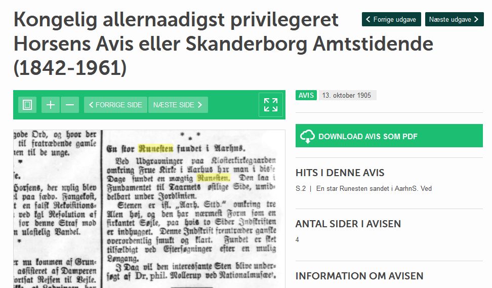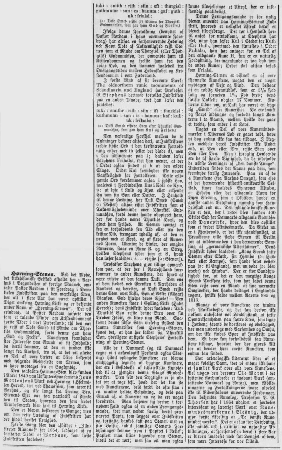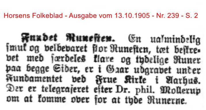 Vom Weinhändler Niels Holm Fulling wurde auch ein Bericht in der Kopenhagener Zeitung "Dagbladet" in der Ausgabe vom 05.05.1859 mit dem Titel "Runestenen i Aarhuus" - auf der S. 2 (3. Spalte unten / vierte Spalte oben) - veröffentlicht.
