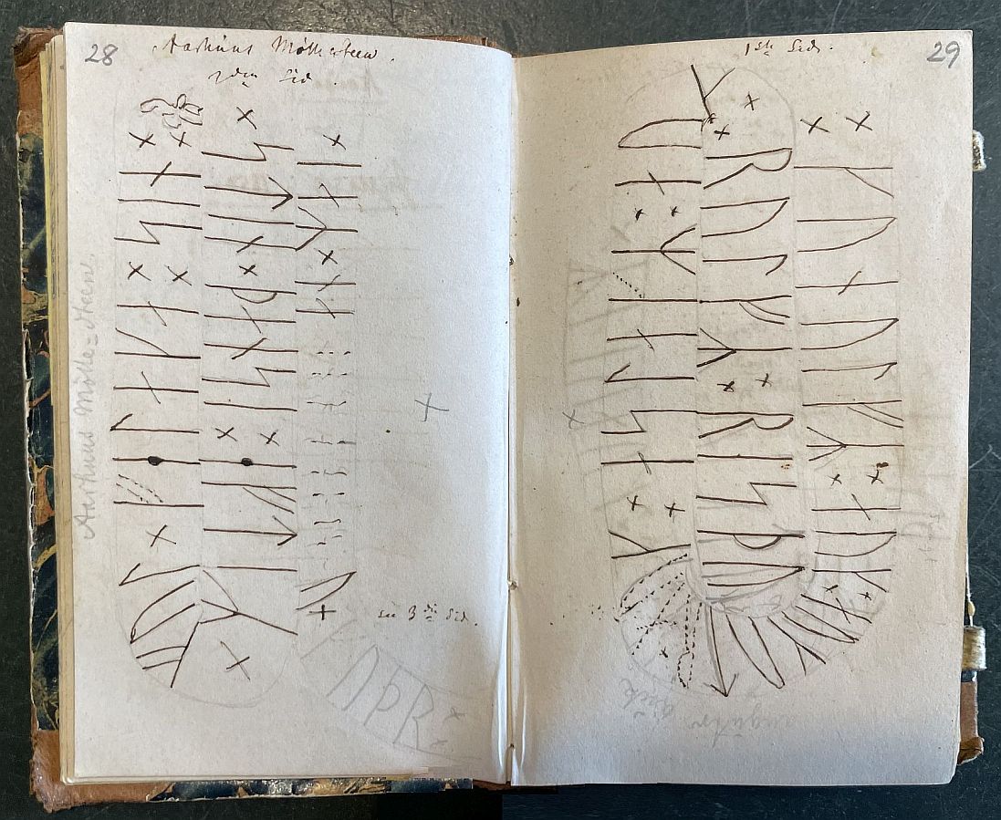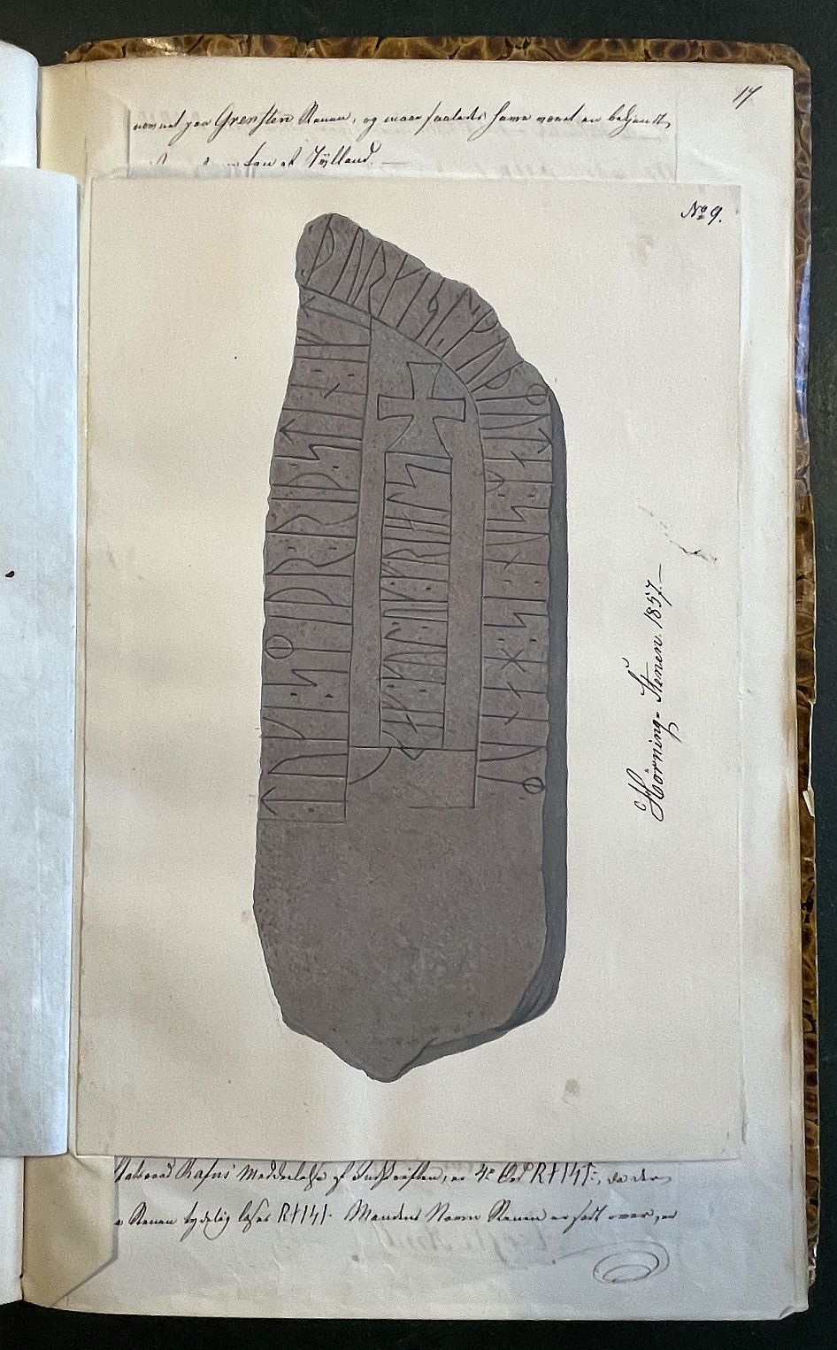 P. G. Thorsens Nachlass (Bezeichnet als: P. G. Thorsens optegnelser, tegninger m.m. vedrørende runer og runemindesmærker - überführt aus der Kopenhagener Universitätsbibliothek 1929 - Gemäß Ministerialschreiben vom 04.03.1929; früher benannt als Additamenta 612 kvart) - befindet sich heute in der Königlichen Bibliothek unter NKS 3296 kvart (in mehreren einzelnen Pappschachteln). In der Pappschachtel Nr. 17 wird diese Zeichnung von Magnus Petersen, datiert auf den 12.10.1869, verwahrt und die ich bei meinem Besuch in der Königlichen Bibliothek in Kopenhagen am 27.09.2022 fotografieren durfte.