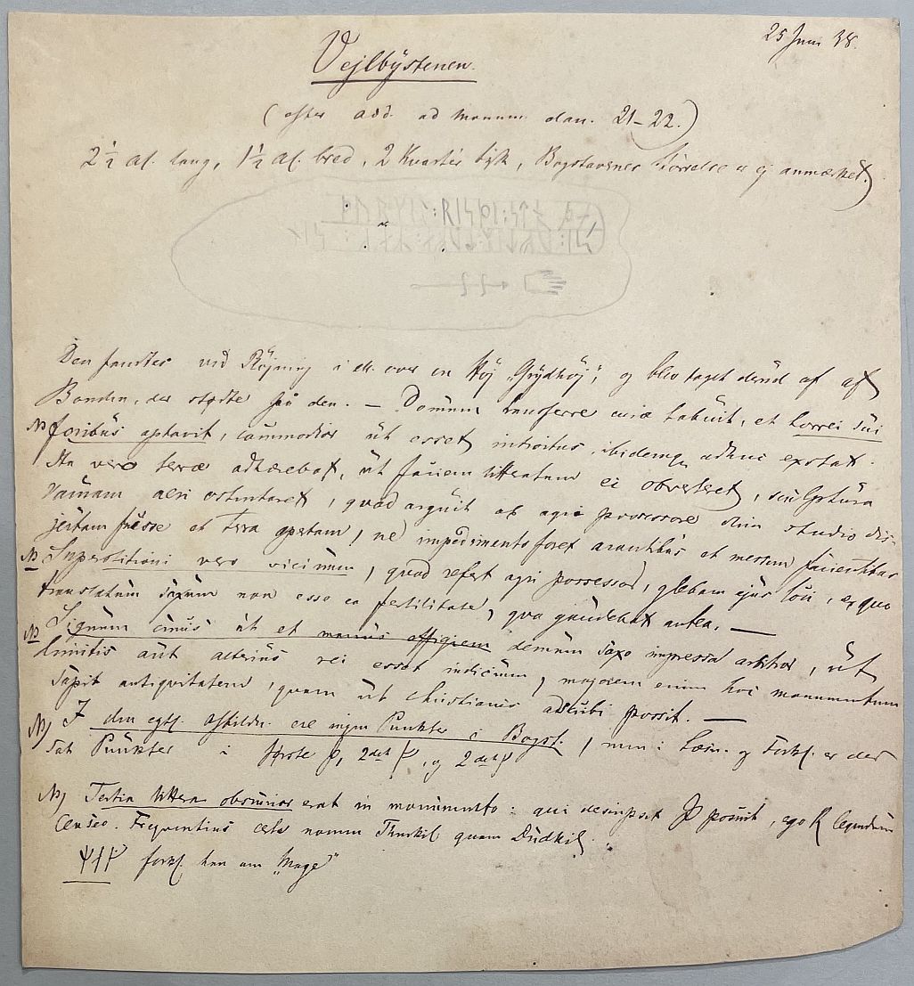 In seinen Unterlagen in der Bibliothek befindet sich zu dem Runenstein von Vejlby unter "III - Originaltegninger af de danske Runemindesmærker, udførte paa Undersøgelsesrejserne af Magn. Petersen og kontrollerede paa Stedet af Ludv. Wimmer, samt Prøvetryk af de paa Grundlag af de nævnte Tegninger, Aftryk o. s. v. til „De danske Runemindesmærker" udførte Afbildninger med Wimmers Rettelser"