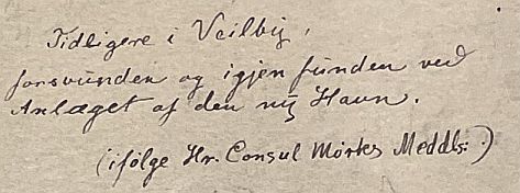 Er bringt in einem Textbeitrag rechts mittig auf dem Blatt die Notiz (übersetzt): "Früher in Veilby, verschwunden und wiedergefunden in der Anlage des neuen Hafens (über Hr. Consul Mörks Mitteilung).