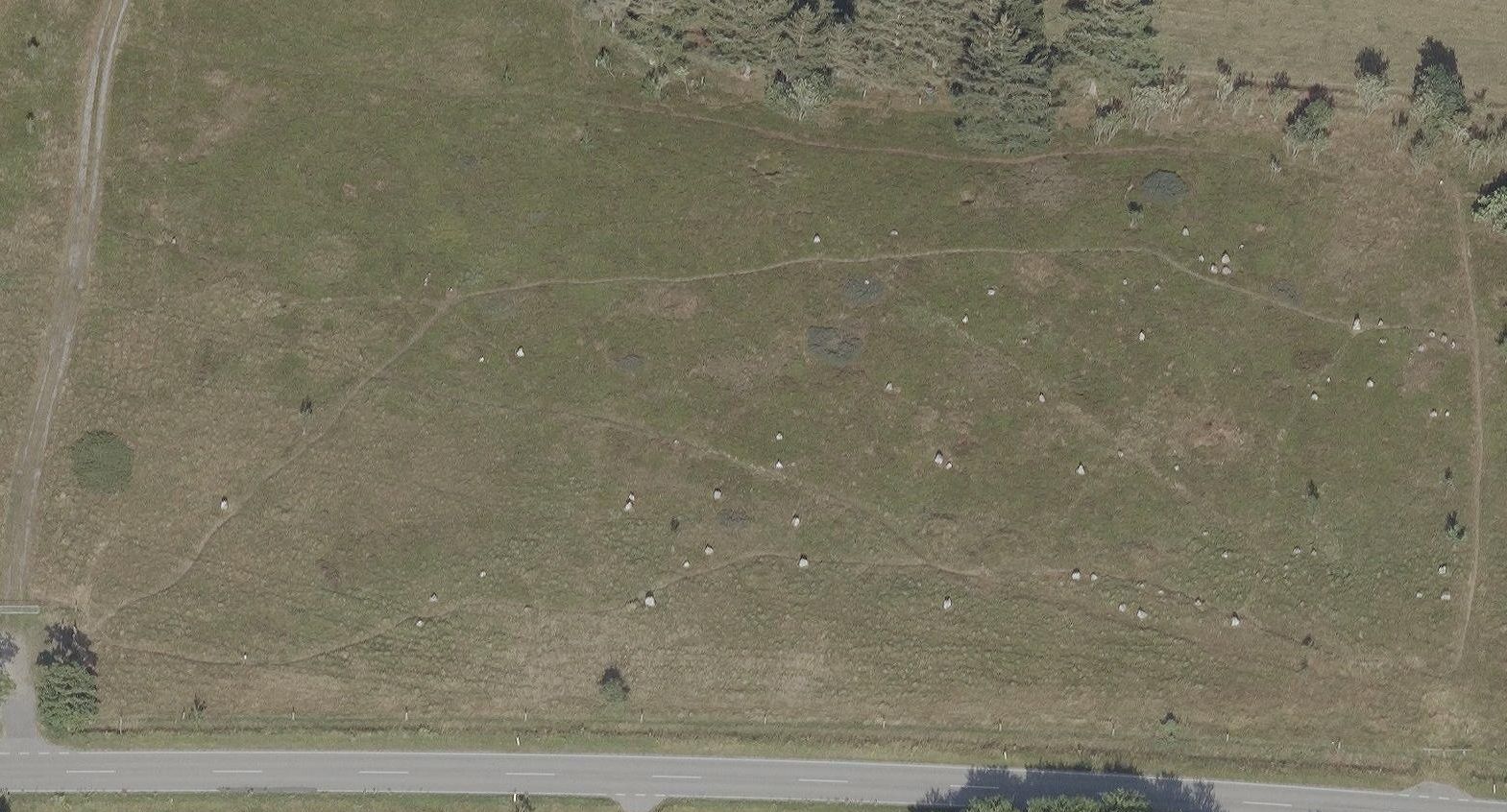 Høj. Auf einer offenen Erika- und grasbekleideten Fläche finden sich 37
