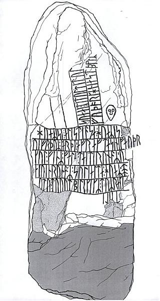 aus, da links vom senkrechten Teil zwei leere Runenbänder vorhanden sind. Die rechte der beiden senkrechten Linien enthält ein vollständiges