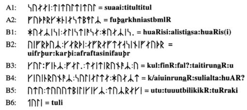 (Horizontale Linien) huaR is i : alisti ąsa : huaR is (:) | uifrþuR : karþi : afr aft asini fauþr | kul:finR : fal(s) : taitirunąR : u | (a)iuinrunąR : sulialta : huaR : ? | utu : tuuut bilikikR : tuR ra(k)(i) | (t)(u)(l)i
