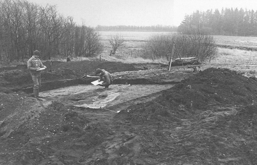 Bereits am Tag nach der Entdeckung wurde auf dem Gelände mit einer kleinen Ausgrabung begonnen. Obwohl das Feld klein war, waren die Ergebnisse spannend, denn es gelang, die Stelle zu finden, an der der Runenstein ursprünglich gestanden hatte, sowie ein Pfostenloch, das möglicherweise im Zusammenhang mit der Errichtung des Steins gegraben wurde. Der Runenstein liegt hier noch im Hintergrund.