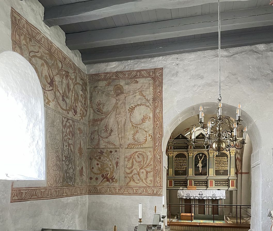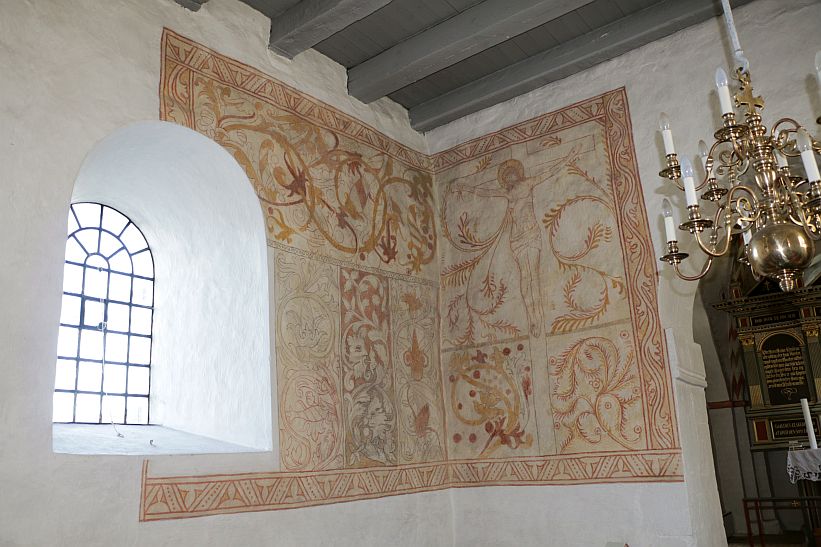 Die Kirche wurde im 12. Jahrhundert zunächst mit Chor und Schiff erbaut; nicht lange danach wurde der Turm hinzugefügt. Es wird vermutet, dass an der Stelle früher eine Holzkirche stand. Die meisten Fresken stammen aus der Zeit der Einführung der Reformation 1530-40. Auf dem Gemälde links vom Chorbogen (über Eck) ist ein Bild des Gekreuzigten; es ist von Ranken umgeben und fein gerahmt. An der Nordwand - 3. Foto oben - sieht man oben: die Leidensgeschichte, das Gebet Jesu in Gethsemane (schlecht erhalten) und seine Darbietung an Pilatus vor dem Hintergrund der Kirchen und Türme einer mittelalterlichen Stadt. Darunter die Kreuzabnahme, die Bestattung und Maria mit ihrem toten Sohn sowie eine Kirche mit Zwiebelturm.