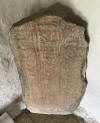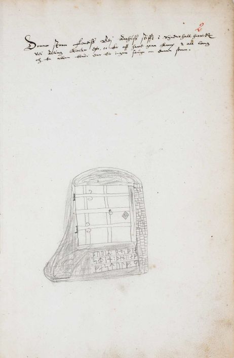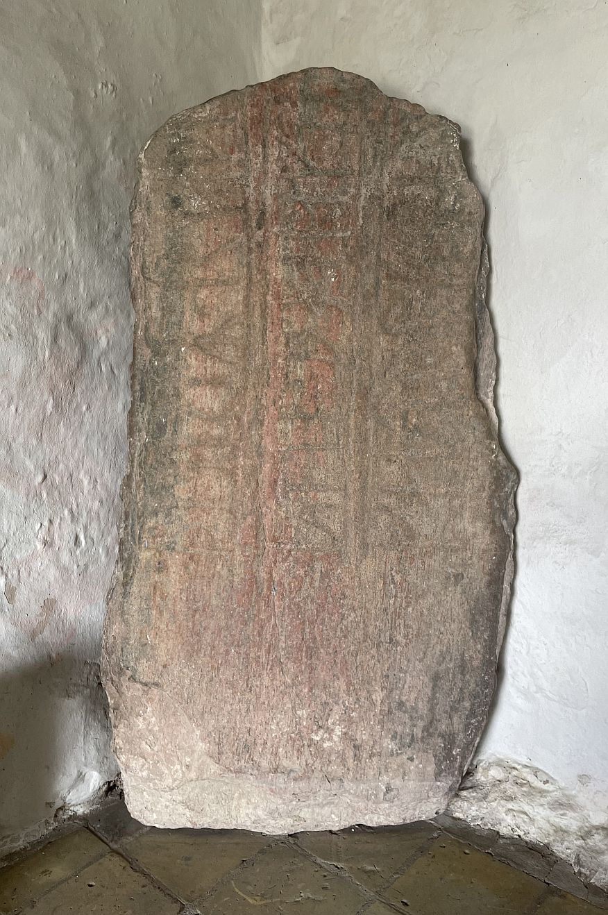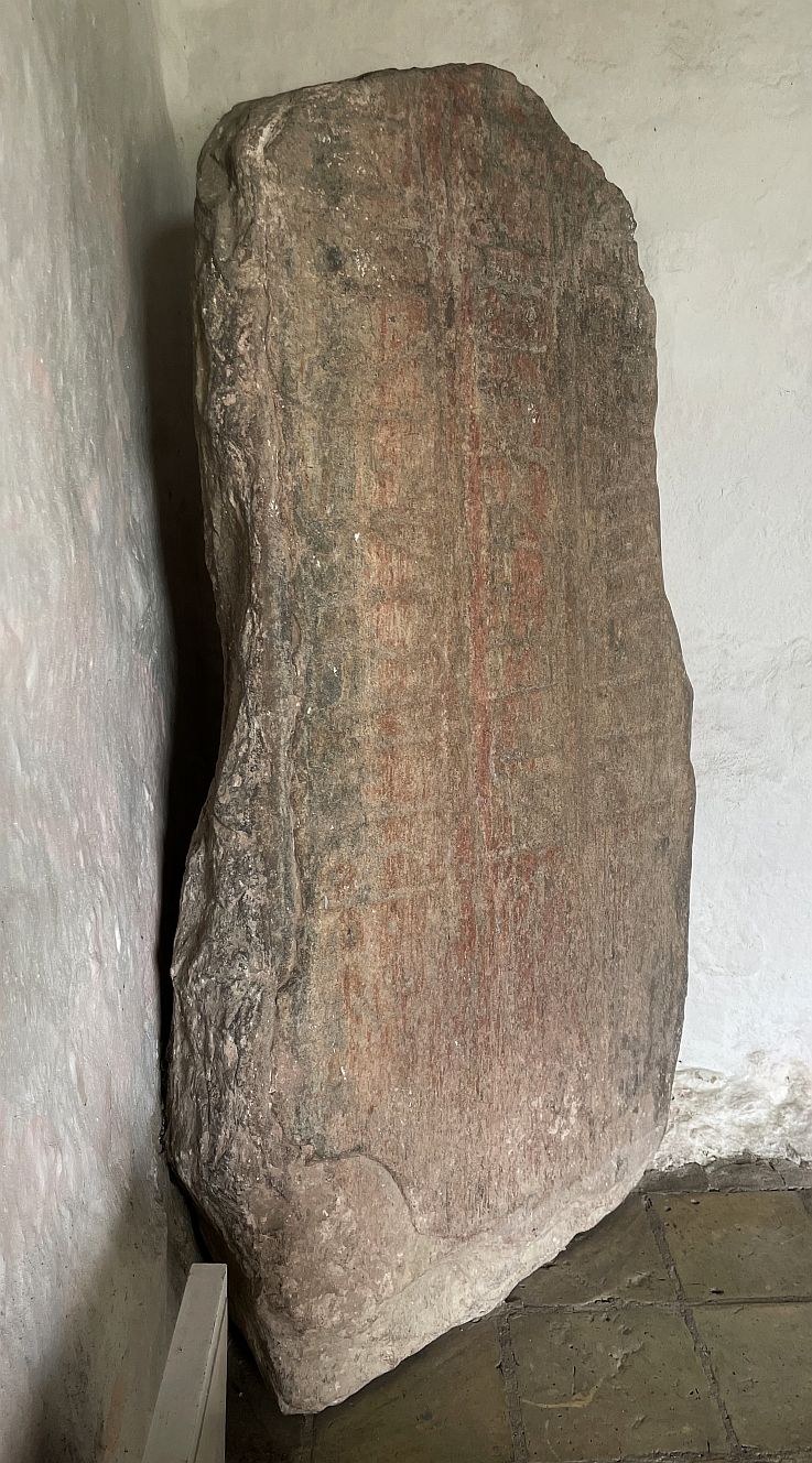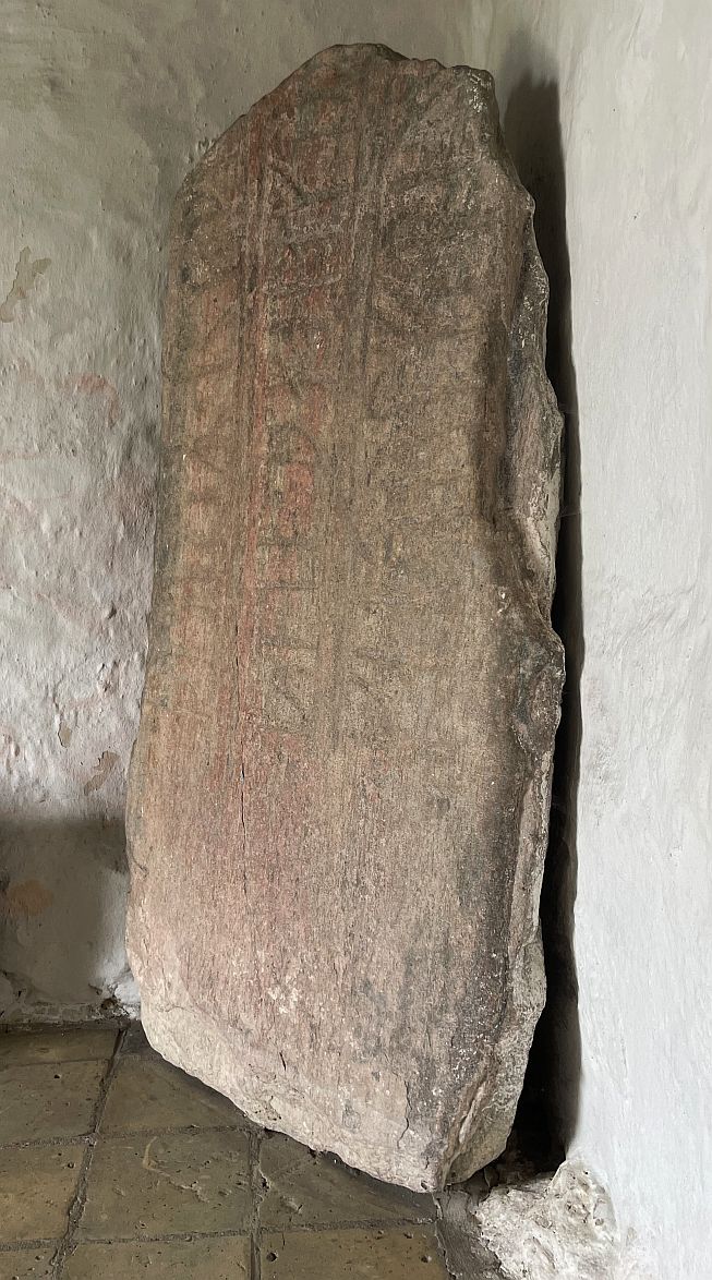 Dazu hat er diese Informationen oberhalb niedergeschrieben:: "Denne steen Findiss Vdi Aarhuss stifft i Sÿnderhall herridt Vdi Alling Kircke dør, oc Er aff haard graa Kamp 2 all lang och En allen bred. der Er ingen saugn om denne steen".