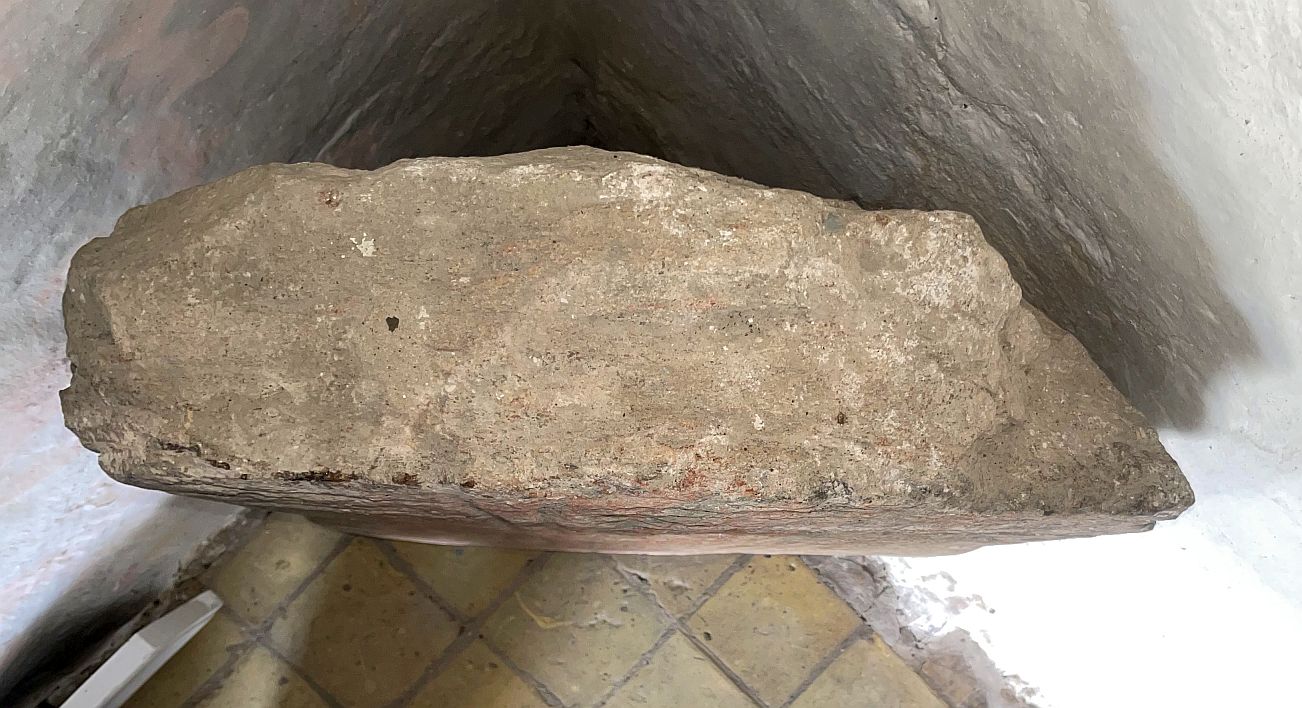 untersucht wurde, lag er noch in der Türöffnung, von einer neuen Bodenfliese bedeckt. Kruse verhandelte mit dem Pastor Jørgen Tørsleff (*05.09.1804 - †13.02.1877, Pfarrer in Vester und Øster Alling ab 08.08.1837 bis 22.07.1858 - link-LIVES) ,