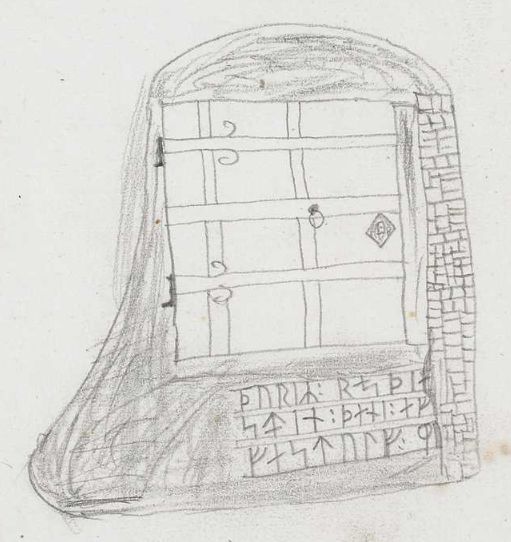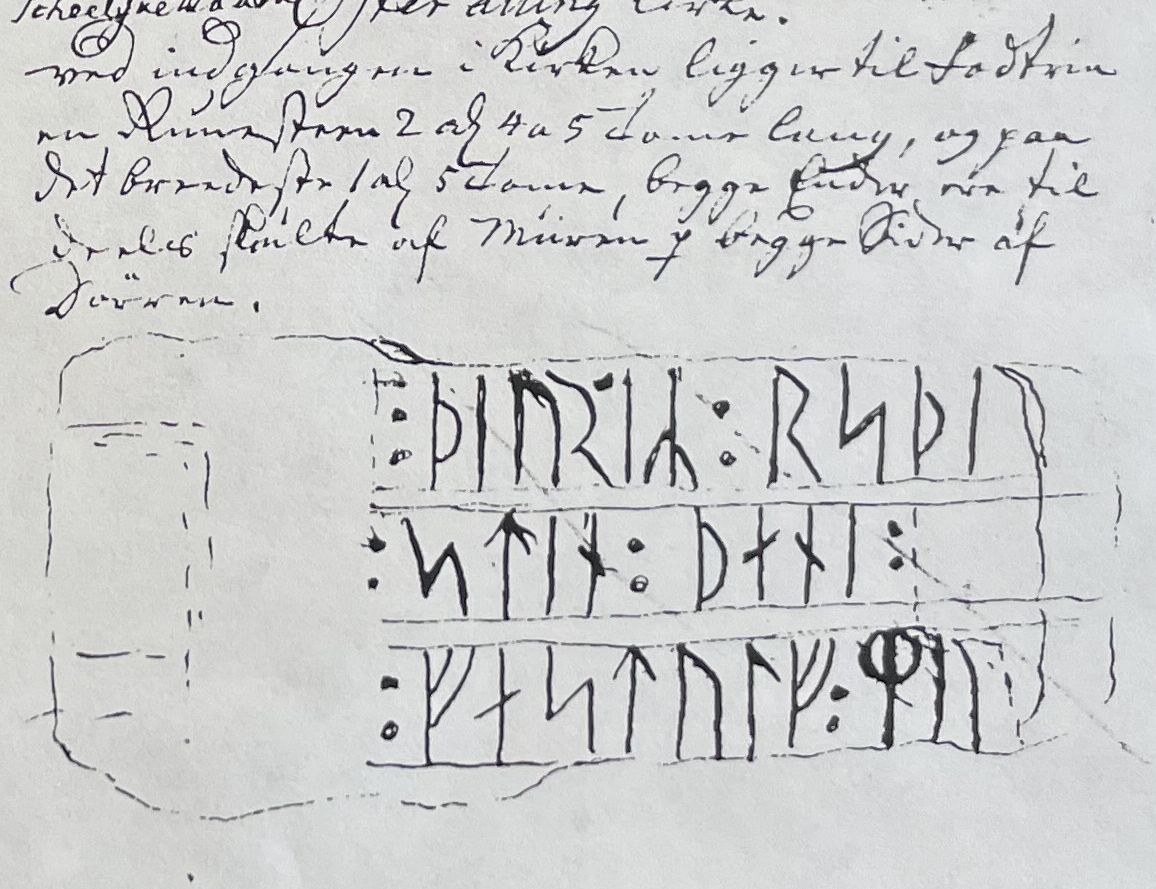 Bei seiner Erfassungstour durch die Lande hat dann Jon Skonvig (*1600 - †1664, Pfarrer und der Runenzeichner für Ole Worm) - um 1627 - diese Zeichnung angefertigt.