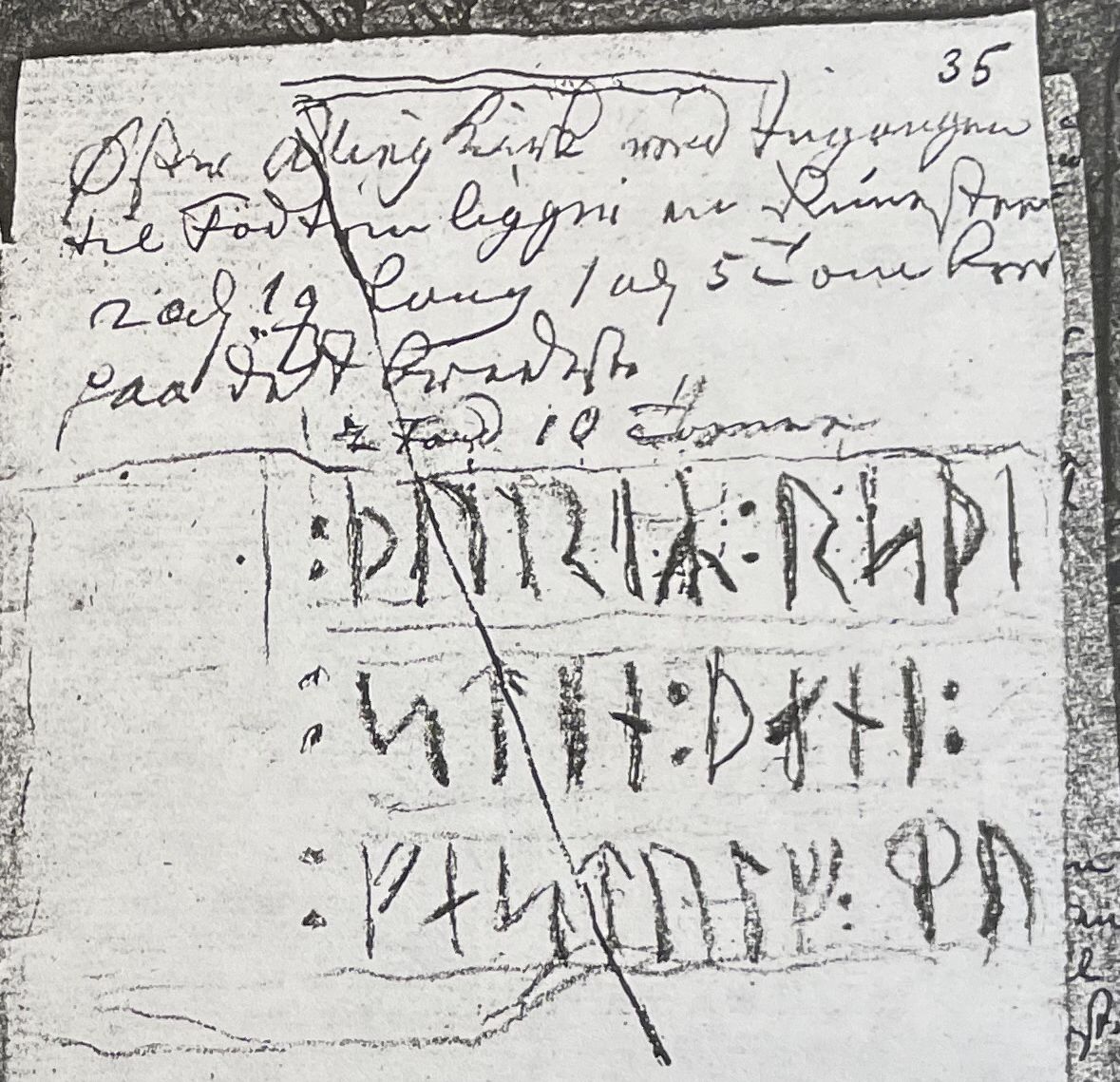 In der Königlichen Bibliothek in Kopenhagen hat sich von Johannes Meier aber auch noch eine zweite Handschrift erhalten - NKS 799 kvart - Joh. Mejeri Monumenta Runica in Dania (pdf-Datei anhand eigener Fotos von mir erstellt). Deren Entstehungsdatum ist nicht bekannt. Der Runenstein findet sich auf Blatt 38.