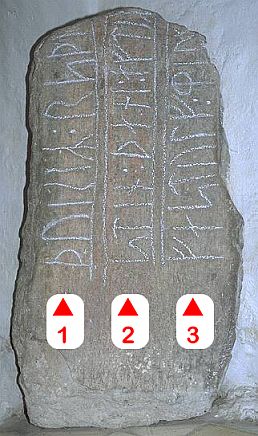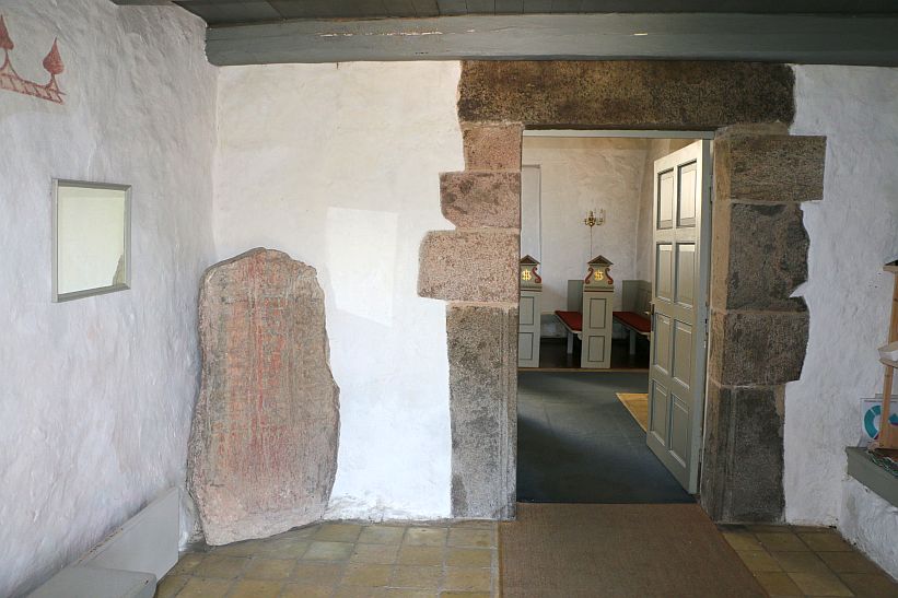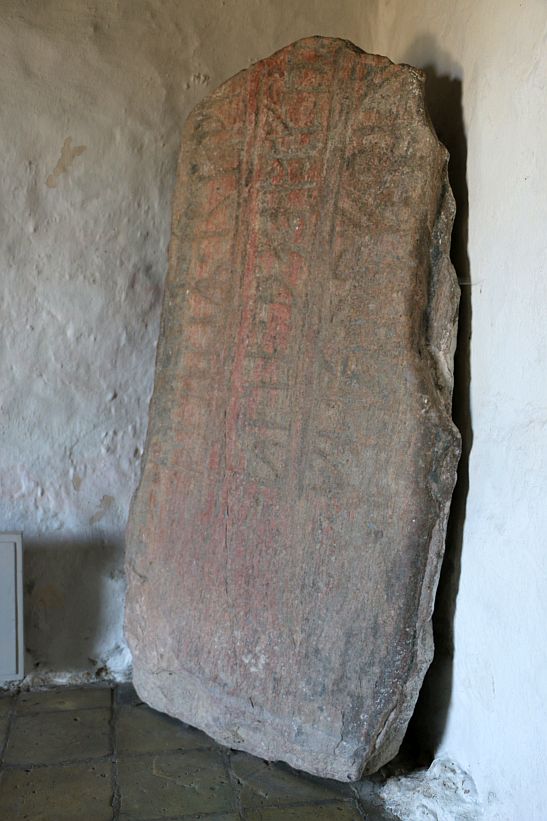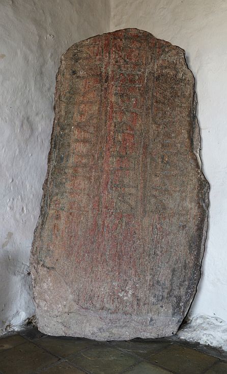 worauf er von diesem die Erlaubnis erhielt den Runenstein herausnehmen und im Waffenhaus, links von der Eingangstür zur Kirche, aufstellen lassen durfte, wo er übrigens noch heute steht.
