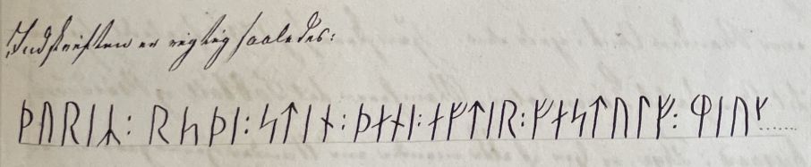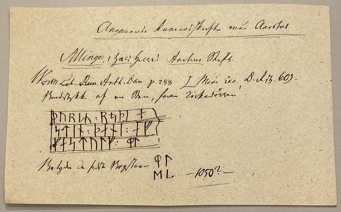 P. G. Thorsens Nachlass (Bezeichnet als: P. G. Thorsens optegnelser, tegninger m.m. vedrørende runer og runemindesmærker - überführt aus der Kopenhagener Universitätsbibliothek 1929 - Gemäß Ministerialschreiben vom 04.03.1929; früher benannt als Additamenta 612 kvart - findet sich heute in der Königlichen Bibliothek unter NKS 3296 (in mehreren einzelnen Pappschachteln). In der Pappschachtel Nr. 17 fand ich bei meinem Besuch am 27.09.2022 diese beiden Notizzettel. Es handelt sich meines Erachtens um handschriftliche Aufzeichnungen von Thorsen.