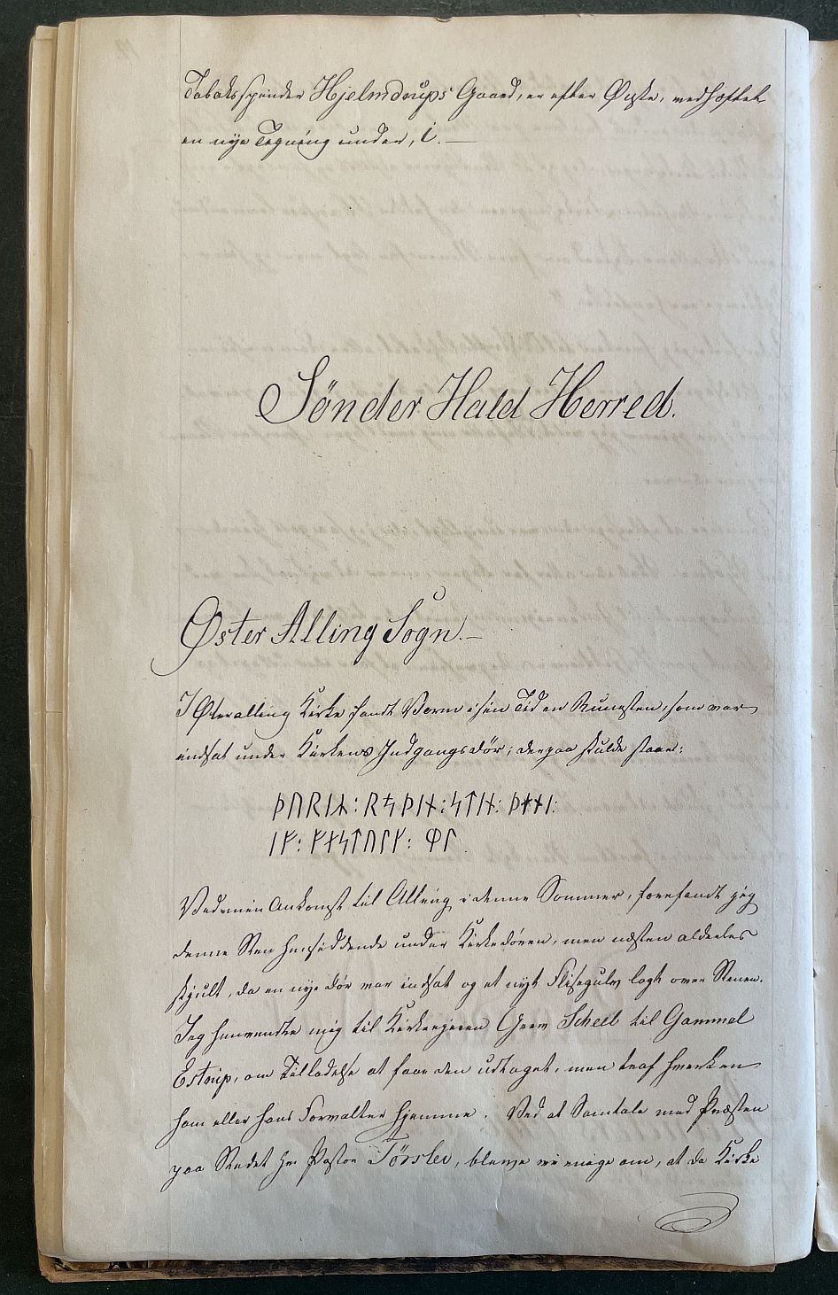 Übersetzung: "Dieser Stein findet sich im Bistum Aarhus in der Harde Sønderhald vor der Tür der Alling Kirche und es ist ein grauer Felsbrocken, 2 Ellen lang und eine Elle breit. Es gibt keine Sage über diesen Stein".