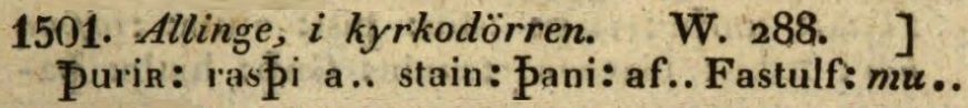 Auf der S. 578 findet sich der Eintrag (übersetzt): "Gjesing ...Worm erzählt im 5. Buch seiner Monumenta, dass in der Alling Kirche in der gleichen Region vor der Türe ein Stück eines Steines liegt, zwei Ellen lang und eine breit, auf dem diese Worte mit Runen geschrieben stehen: Thunir resdia stin deni efter Factulssimi. Worms Übersetzung: Thor errichtete diesen Stein zum Gedenken an Fastulv - Seite 579 - mein ... Zeichnung."