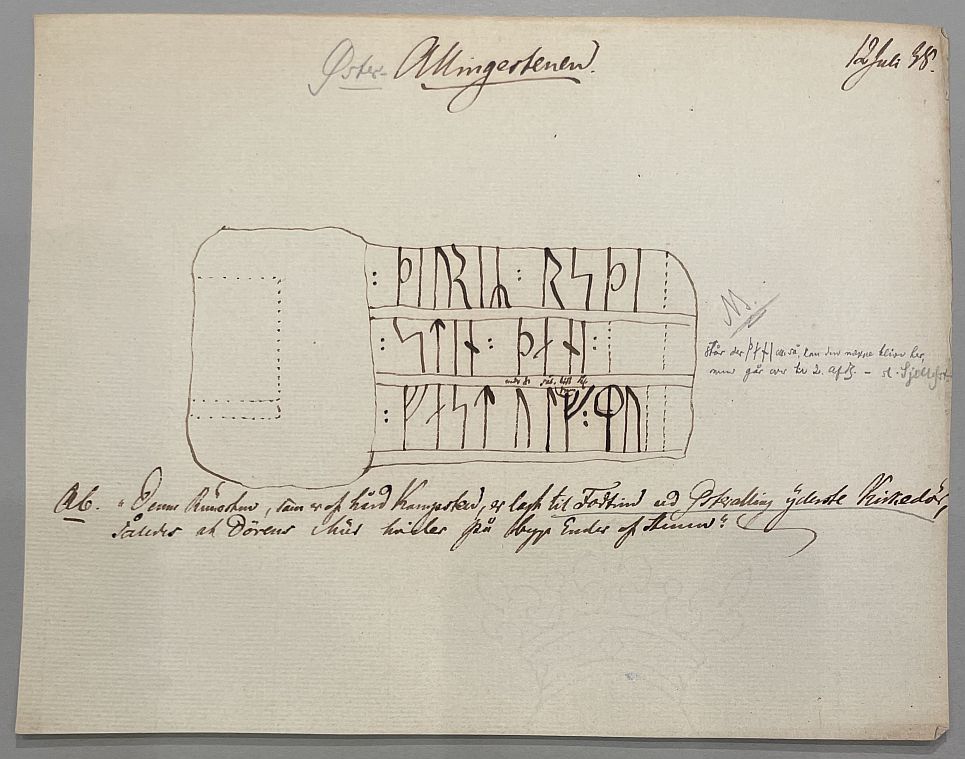 zu dem Runenstein von Øster Alling unter der Nr. 46 Aufzeichnungen, wobei ich diese Zeichnung von Prof. Julius Magnus Petersen - datiert auf den 31.08.1877 - am 27.09.2022 fotografieren durfte.