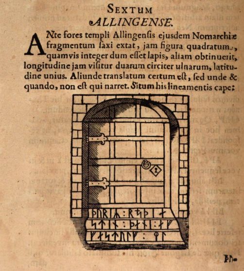 Übersetzung: "Ole Worm berichtet in seiner Danicorum Monumentorum Libri Sex auf der S. 288, dass außerhalb der Kirchentür von Alling ein Stein lag, der zuvor an einem anderen Ort gestanden hatte, auf dem in Runenschrift geschrieben steht, dass Thore diesen Stein über Fastulv errichtete. Aber es wird nicht erwähnt, ob es Øster oder Vester Alling ist."