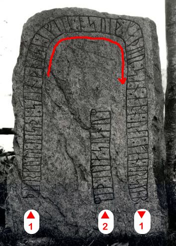 Die Inschrift wird von den Runologen in die Zeit von 970 - 1020 datiert. Sie verläuft von links unten im Bogen entlang der Steinkontur nach rechts unten. Sie endet in dem mittleren Runenband, das von unten nach oben gelesen wird.
