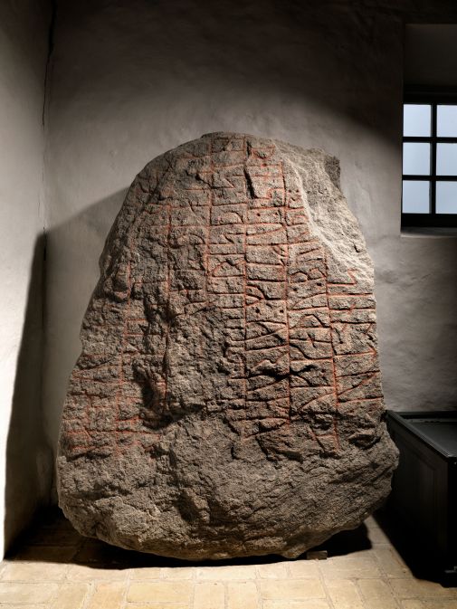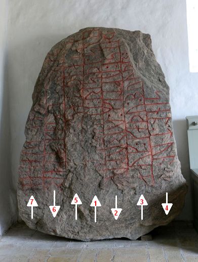 Es ist der am schwierigsten zu lesende dänische Runenstein. Die Steinoberfläche gleicht einer Mondlandschaft mit Bergen und Kratern. Weder Scheinwerfer noch Taschenlampe können hier weiterhelfen. Im Detail ist die Inschrift unleserlich und ungedeutet. Es ist jedoch klar erkennbar, dass der Stein von einem Mann für seinen beiden Brüder errichtet wurde. Die Inschrift wird auf die Zeit 970 - 1020 datiert. Die Inschrift verläuft über insgesamt sieben senkrechte Linien und beginnt mit der mittlersten Linie von unten nach oben. Danach verläuft sie als sogenanntes "Bustrophedon" - bedeutet abwechselnde Schreibrichtung nach rechts und nach links.