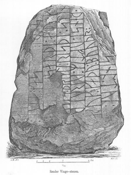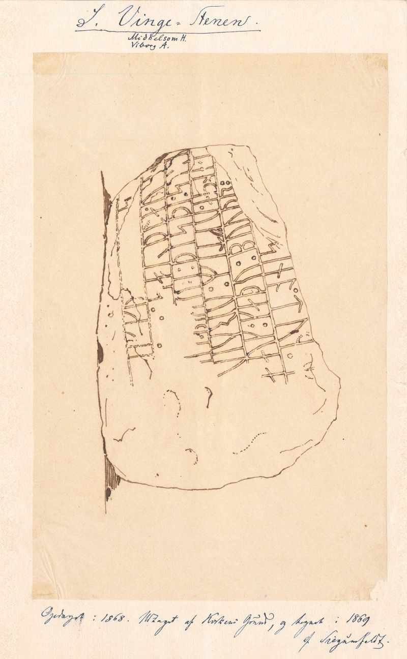 und fügte dem eine Kopie einer Zeichnung von "Siegumfeldt" bei (Laut DR, Textband, 1942, Nr. 83, S. 120). Im Brief schreibt Pfarrer Theodor Christian Taaffe (übersetzt): "...eine Zeichnung des S-Vinge-Steins, die vom Genremaler Siegumfeldt angefertigt wurde, der bei mir wohnt. Die Zeichnung wurde bei Tageslicht ausgeführt und hilfsweise fuhr er mit den Fingern über den unebenen Stein, denn Siegumfeldt waren Runen völlig unbekannt".