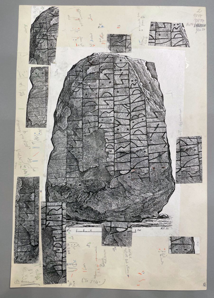 Prof. P. G. Thorsens Nachlass (Bezeichnet als: P. G. Thorsens optegnelser, tegninger m.m. vedrørende runer og runemindesmærker - überführt aus der Kopenhagener Universitätsbibliothek 1929 - Gemäß Ministerialschreiben vom 04.03.1929; früher benannt als Additamenta 612 kvart - findet sich in der Königlichen Bibliotek unter NKS 3296 (in mehreren einzelnen Pappschachteln). In der Pappschachtel Nr. 17 wird diese Zeichnung, die er auf den 05.10.1869 datiert hat, verwahrt und die ich bei meinem Besuch in der Königlichen Bibliothek in Kopenhagen am 27.09.2022 fotografieren durfte.
